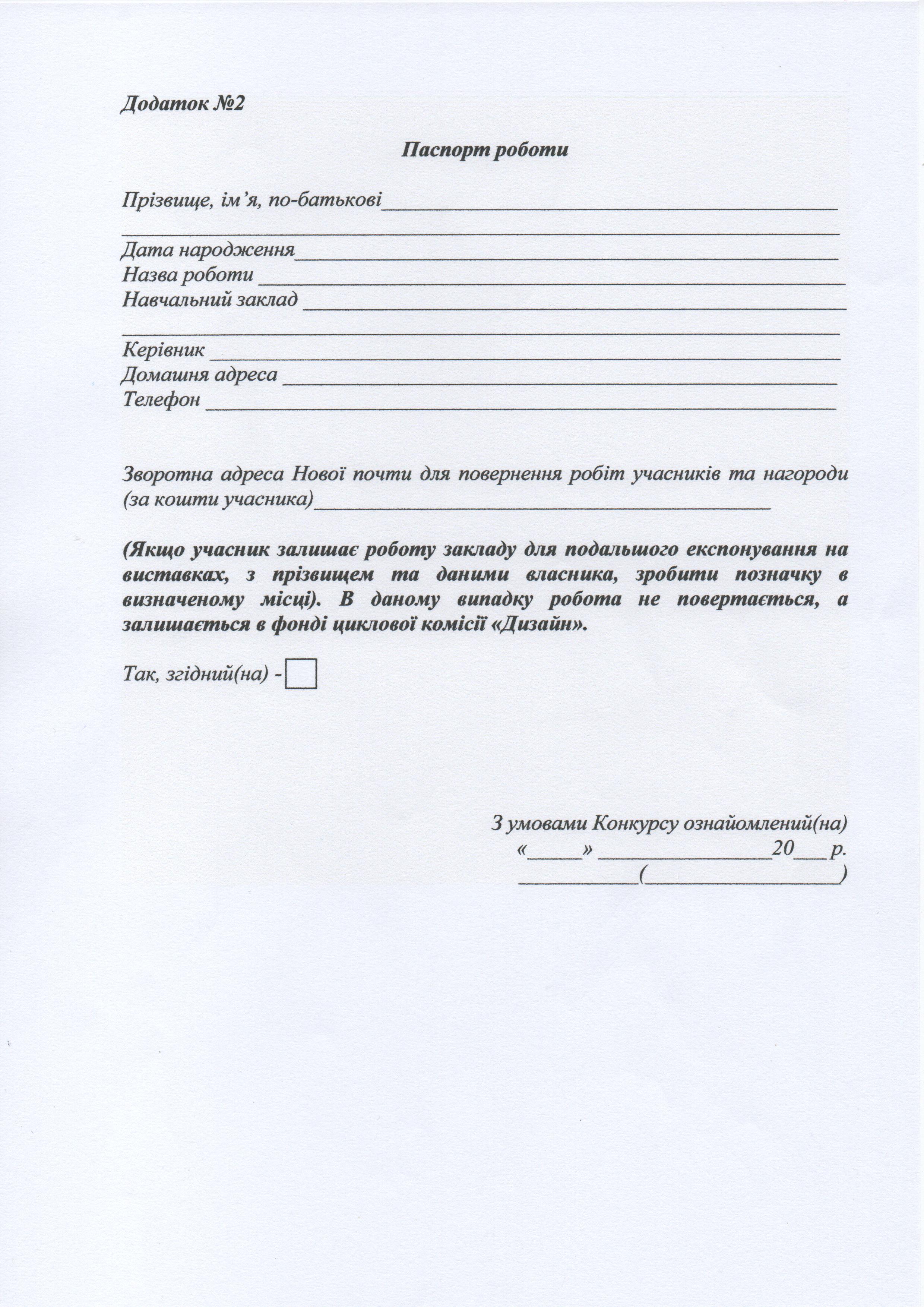 - Надані на конкурс роботи, дипломи учасників, каталоги підсумкової виставки повертаються через поштові відділення «Нова пошта» за кошти учасників.