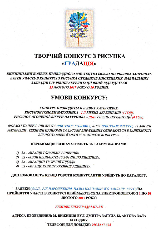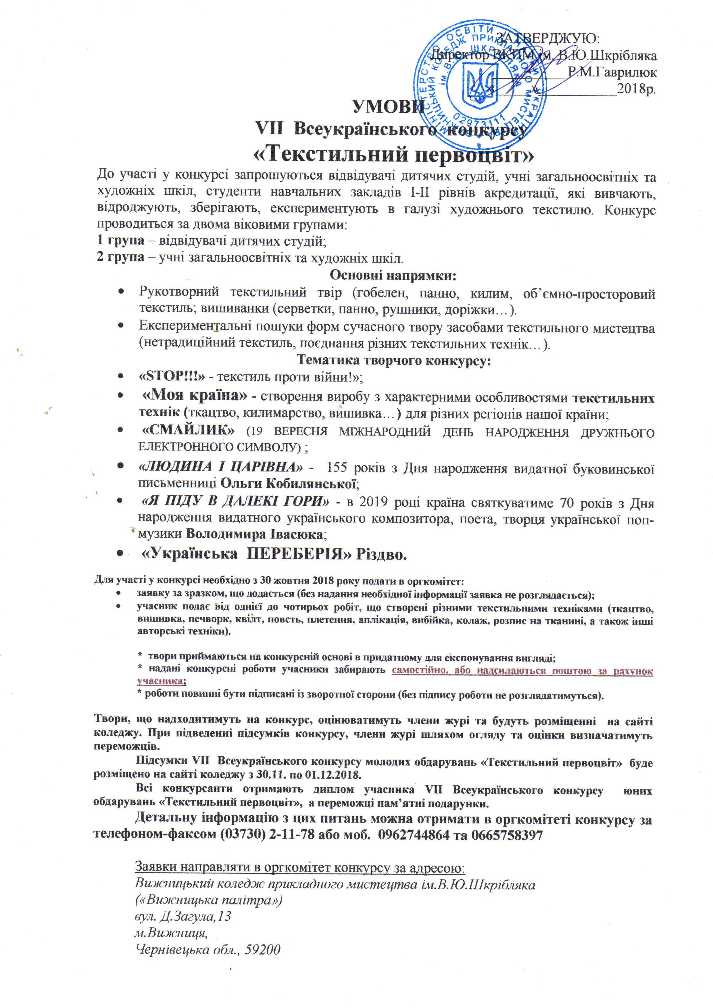 Увага! Інформація для учасників VІII Всеукраїнського конкурсу з образотворчого та декоративно-прикладного мистецтва «Вижницька палітра 2018».