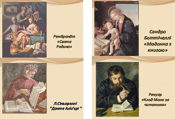 Витвори образотворчого мистецтвазавжди виступали важливим аргументом на користь читання. Картини художників, на яких зображені люди з книгою в руках, мають незрівнянно велику переконливу силу й наочно підтверджують необхідність читання в усі часи.