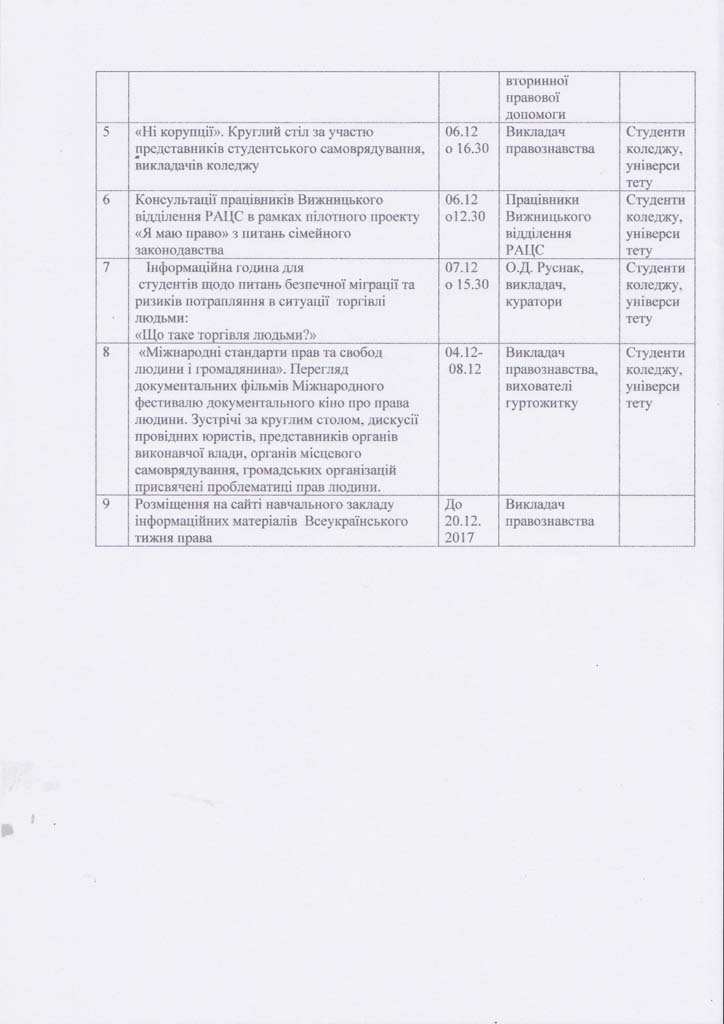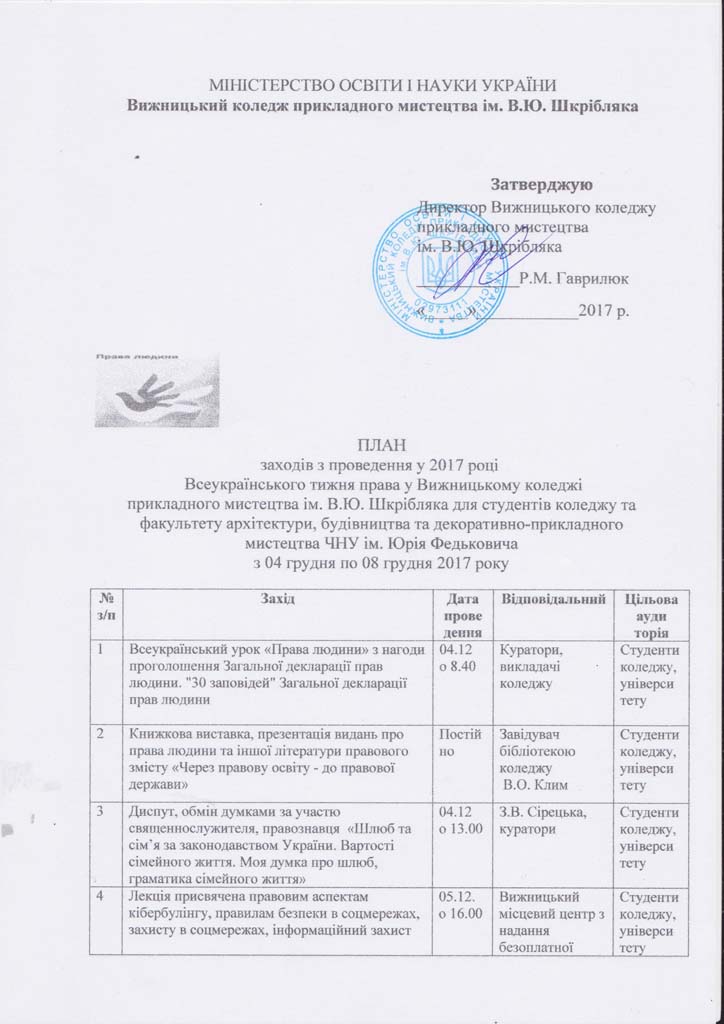 З метою підвищення загального рівня правової культури та вдосконалення системи правової освіти, набуття студентами необхідного рівня правових знань, формування в них поваги до права, забезпечення доступу до джерел правової інформації з04 по 08 грудня 2017 року у Вижницькому коледжі прикладного мистецтва ім. В.Ю. Шкрібляка та факультеті архітектури, будівництва та декоративно-прикладного мистецтва ЧНУ ім. Юрія Федьковича буде проведено Тиждень права в рамках Всеукраїнського Тижня правових знань. Запрошуємо студентів, викладачів взяти активну участь у проведення заходів.